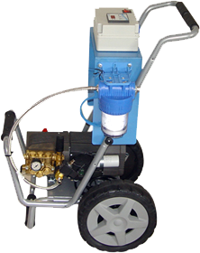 Ce type de pompe haute pression s’utilise sur les chantiers et surtout sur sites intérieurs de désamiantage afin de rabattre les poussières lors des travaux. Facile à mettre en place, il reste hors zone amiante, grâce à un système de fixation et défixation de sa rampe. Il alimente celle-ci qui sera à l'intérieur du sas ainsi la rampe seule sera à décontaminer. Mais il peut s'utiliser dans tous secteurs d'activités.